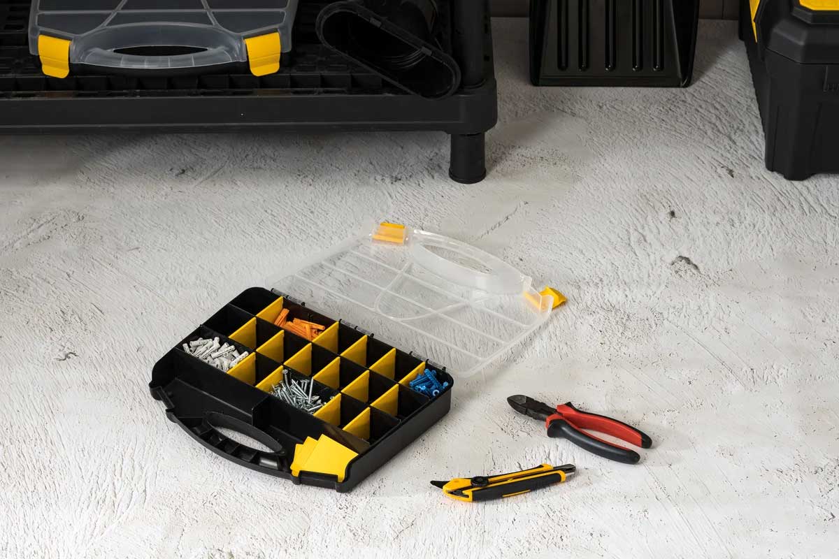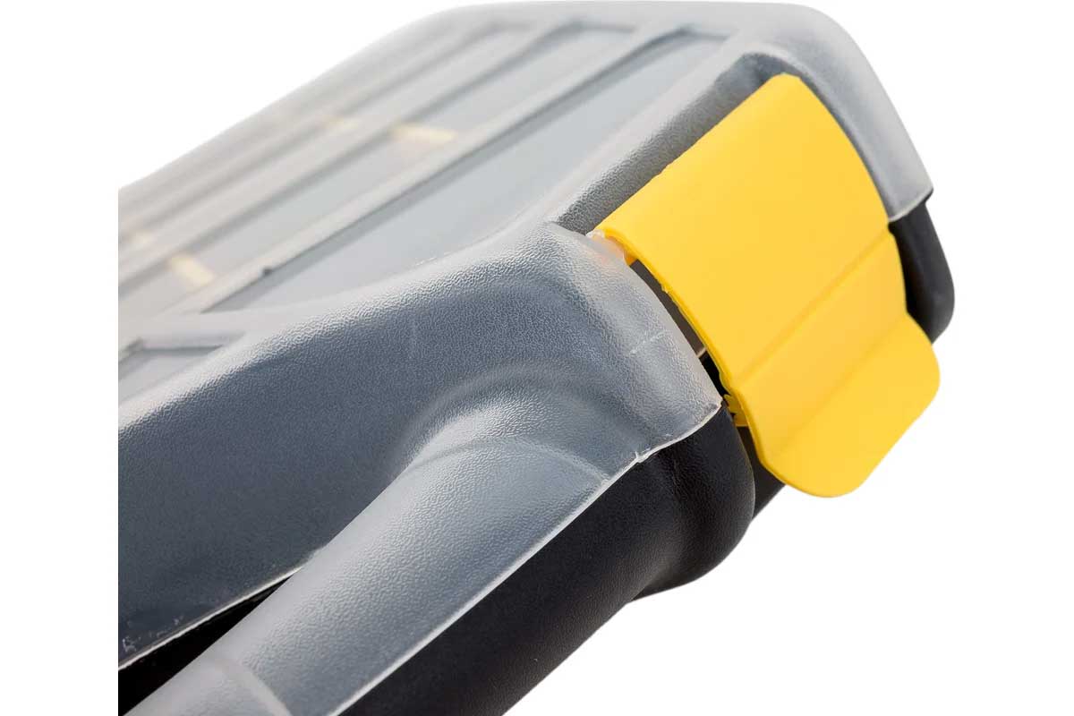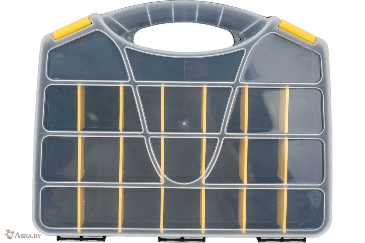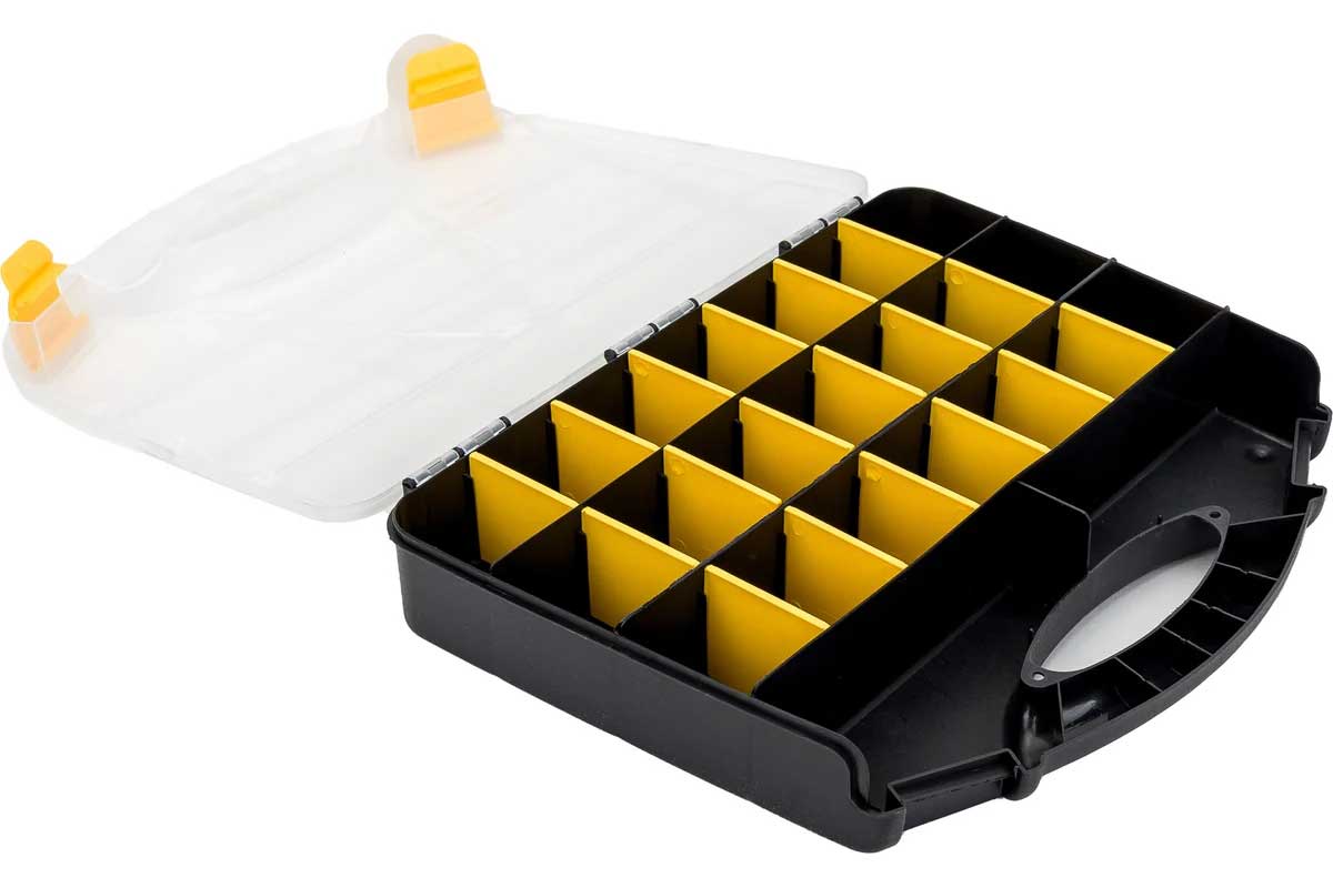 Корпус выполнен из высококачественного пластика, устойчивого к ударам, влаге и перепадам температур. Прозрачная крышка обеспечивает мгновенный обзор содержимого, а продуманная система отделений гарантирует порядок даже при активной транспортировке. Усиленные защёлки надёжно фиксируют крышку. Органайзер подходит для профессионалов строительной и ремонтной сферы, а также для складского использования.