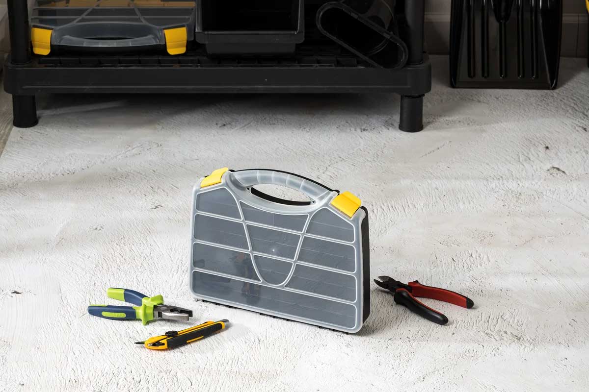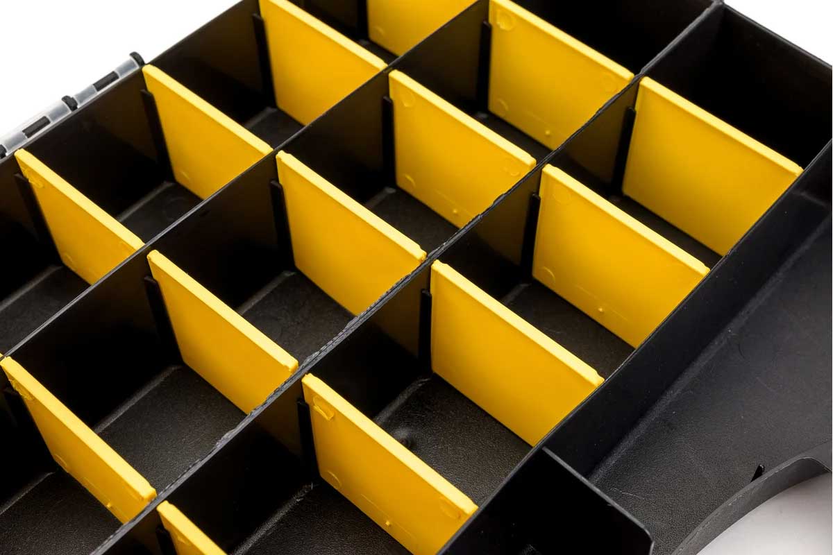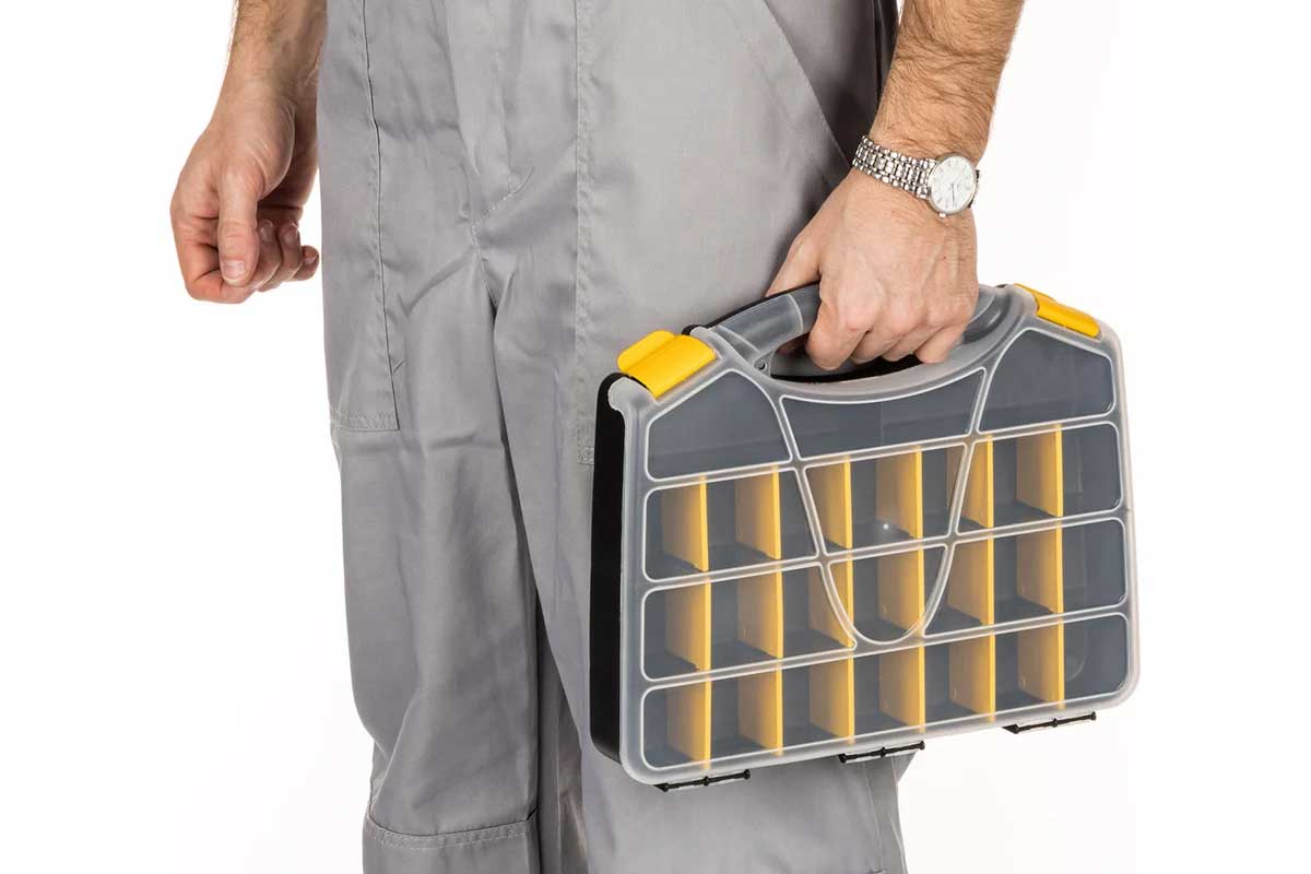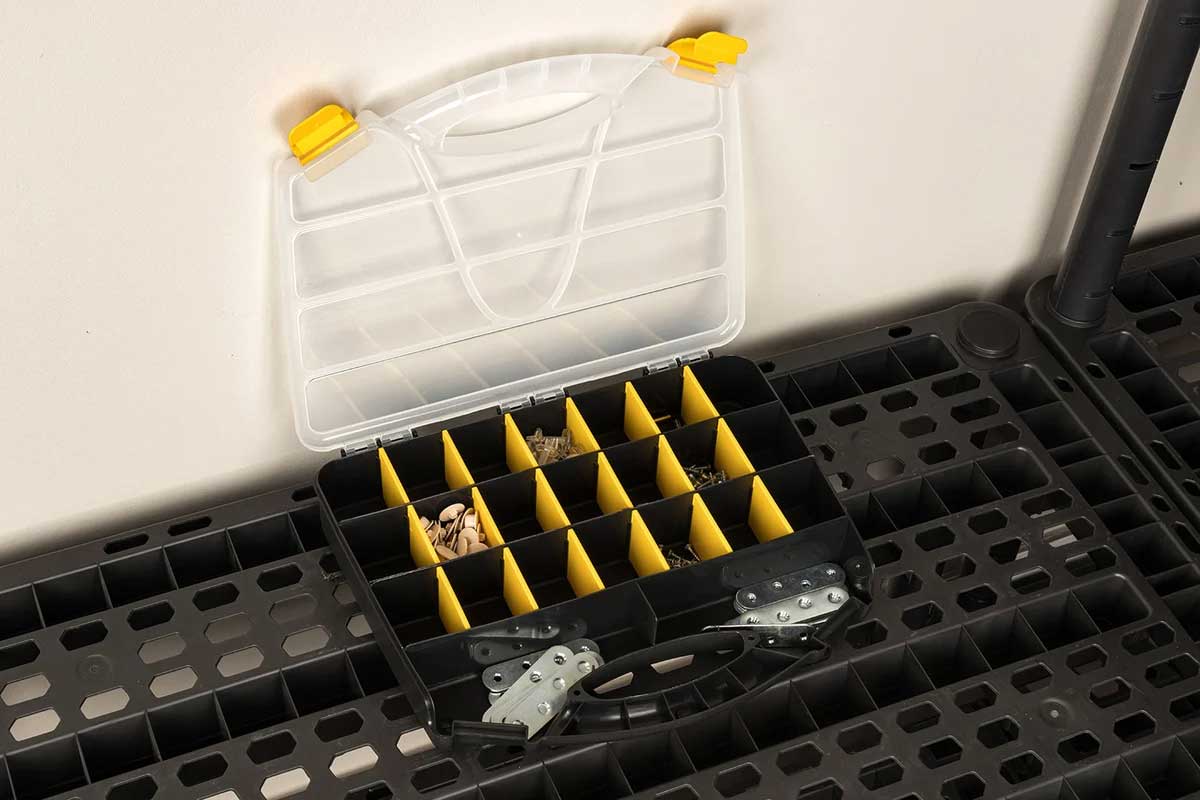 Корпус выполнен из высококачественного пластика, устойчивого к ударам, влаге и перепадам температур. Прозрачная крышка обеспечивает мгновенный обзор содержимого, а продуманная система отделений гарантирует порядок даже при активной транспортировке. Усиленные защёлки надёжно фиксируют крышку. Органайзер подходит для профессионалов строительной и ремонтной сферы, а также для складского использования.
